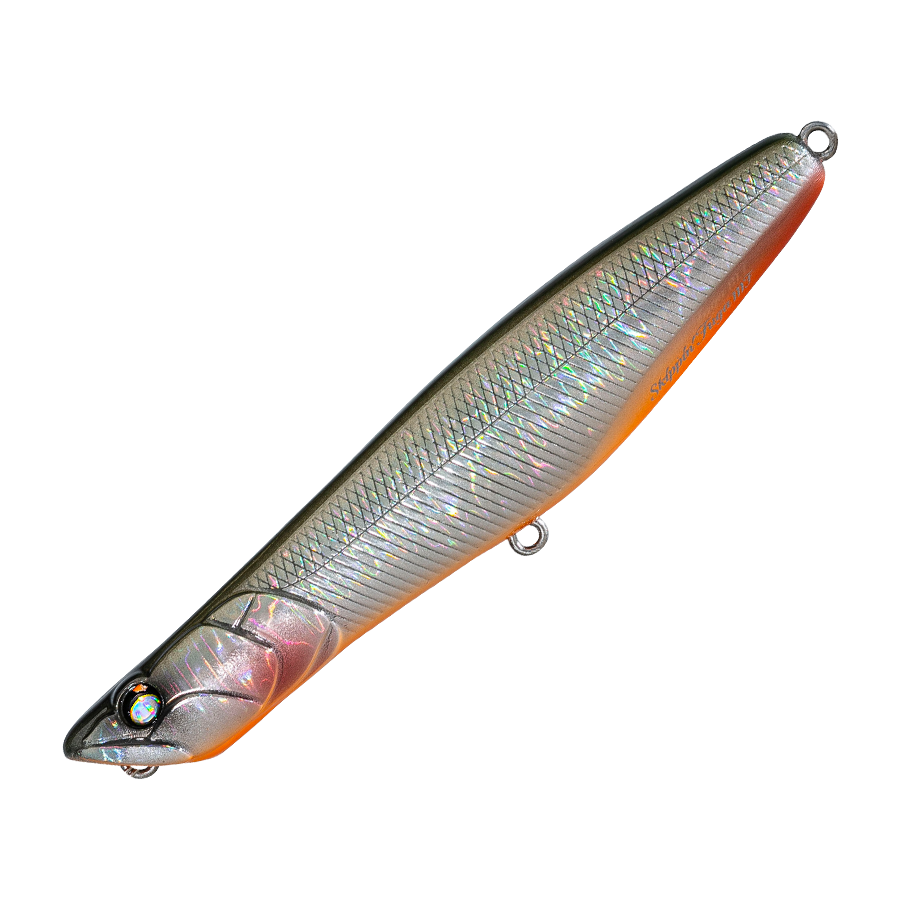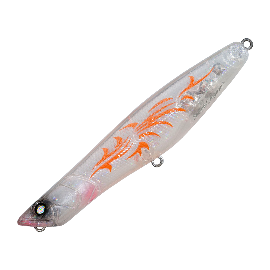 後方固定重心のスリムなボディは、空気抵抗が少なく、総重量のわりに軽いキャストでも気持ちよく飛びます。アクションは、チョッピング、ドッグウォークや前方への移動距離を抑えたショートスライドなど、きわめて多彩。動きのたびに小さなカップから、飛沫とサウンドが発生。タダ巻きしながらロッドティップの振動を加えると、遁走系のアクションも可能だし、タイミングを計ればやる気の緩やかなS字スイミングも可能。組み合わせ次第で、レギュラーからいレギュラーまで、様々なアクションが展開できます。河川、湖沼、サーフ、磯と使用場所は問いませんが、サラシや水流の中にできた小さな緩衝スポットなどでは、動きの多彩さと移動距離の少なさが特に活きます。